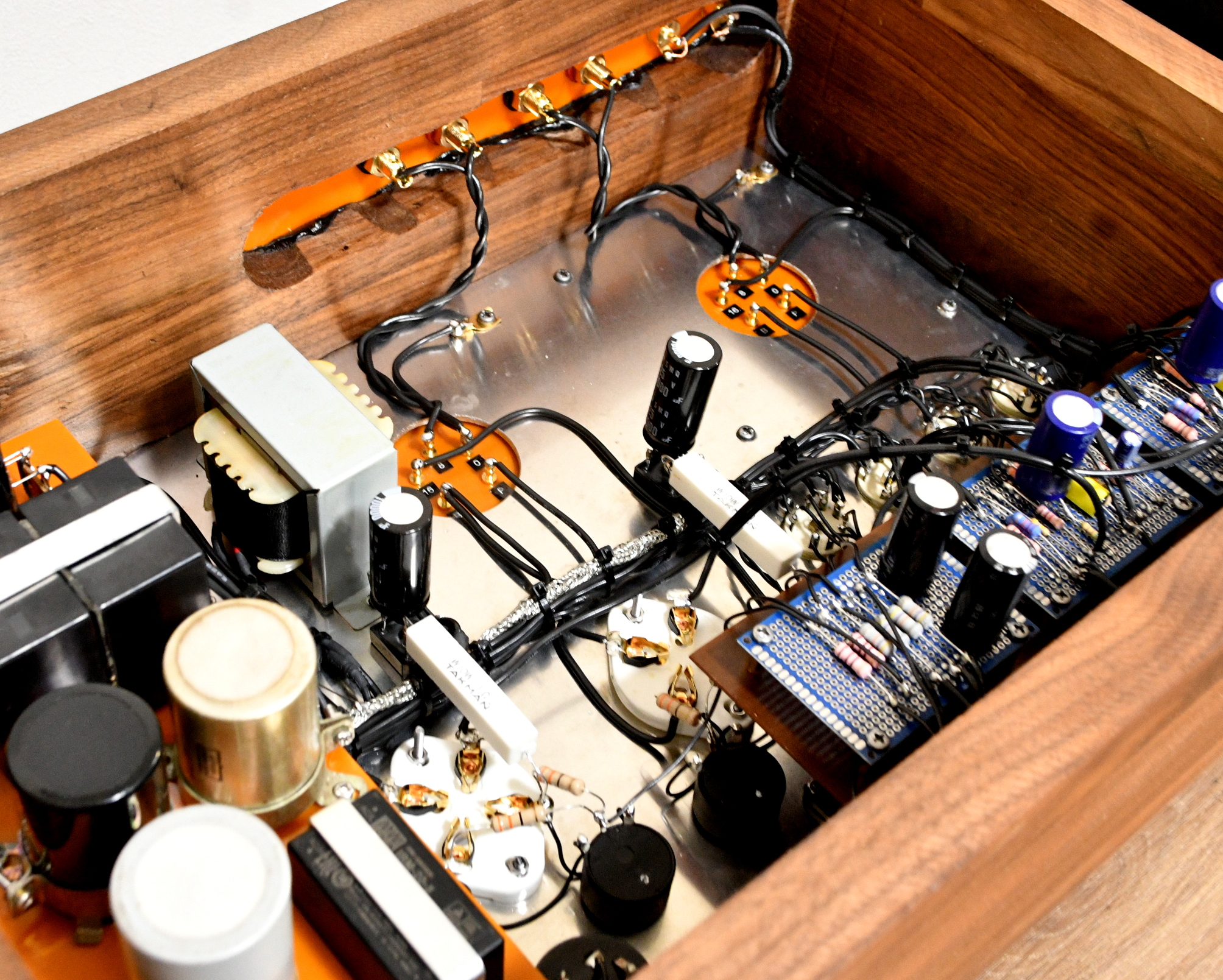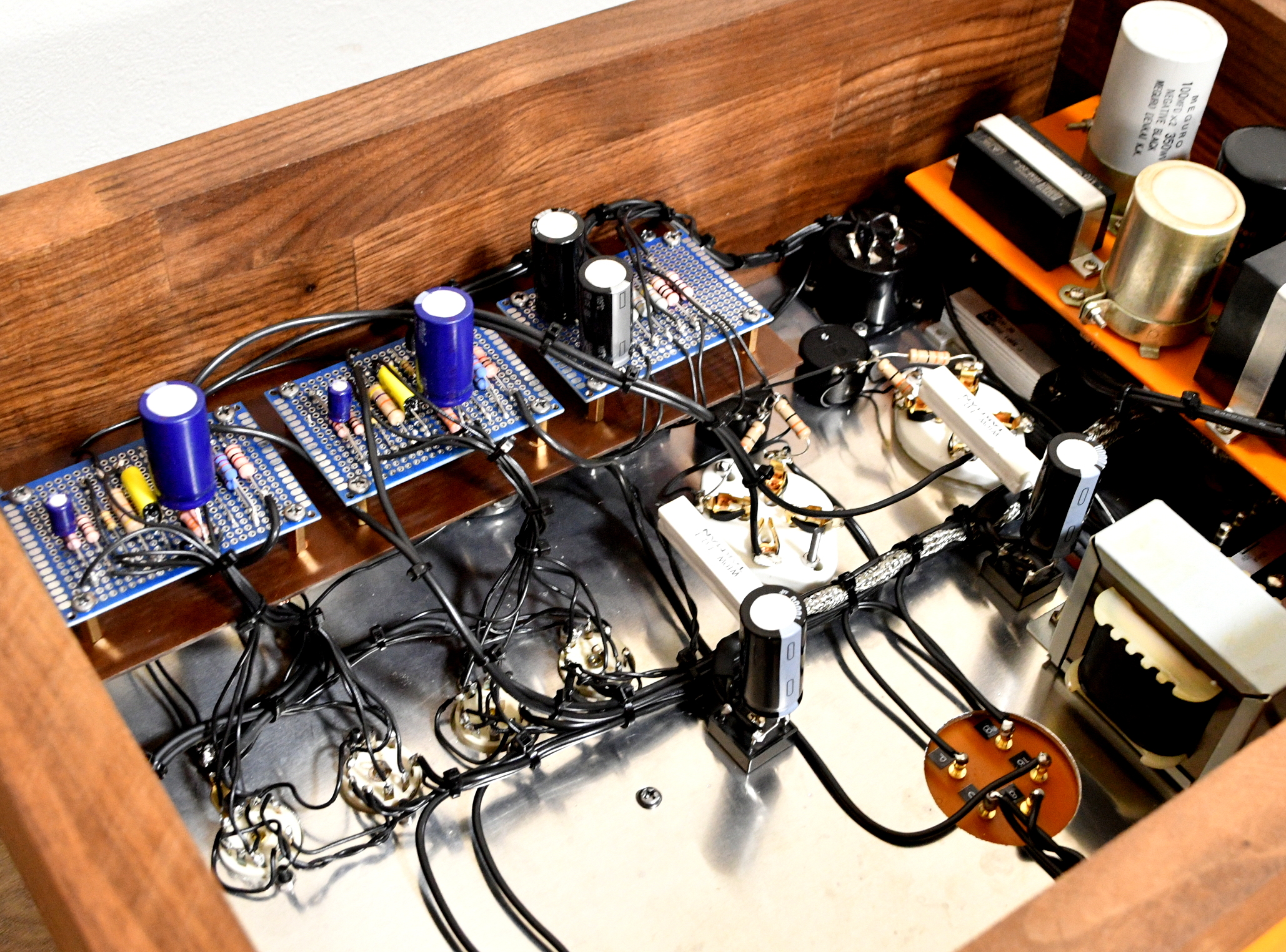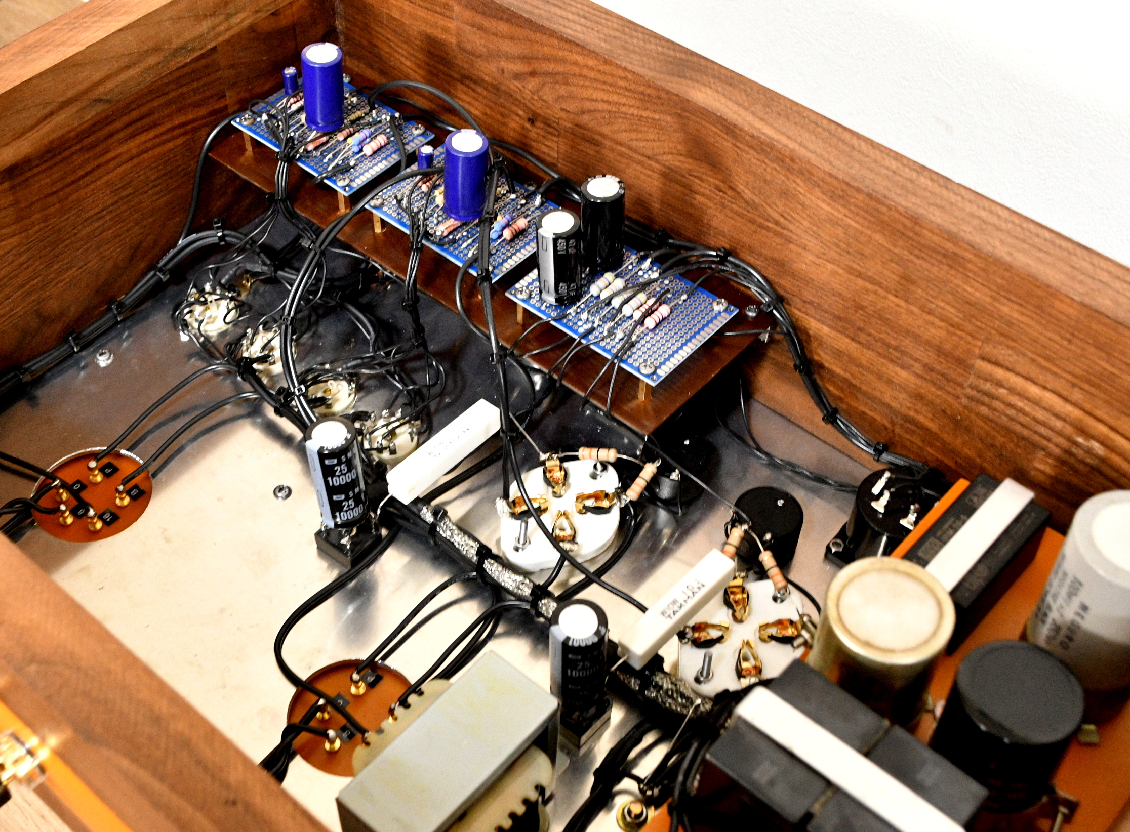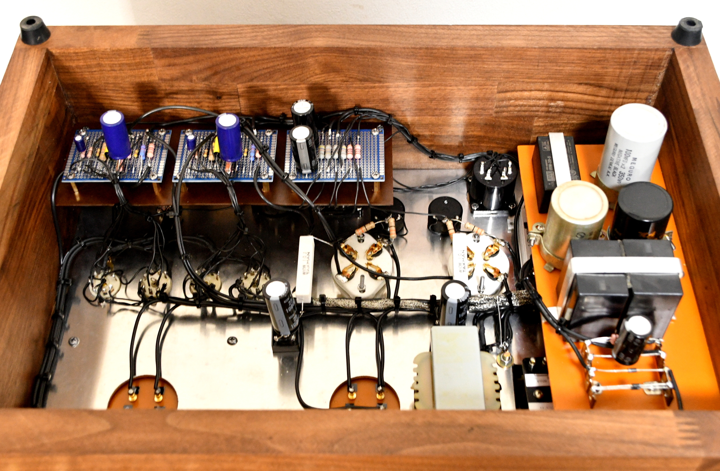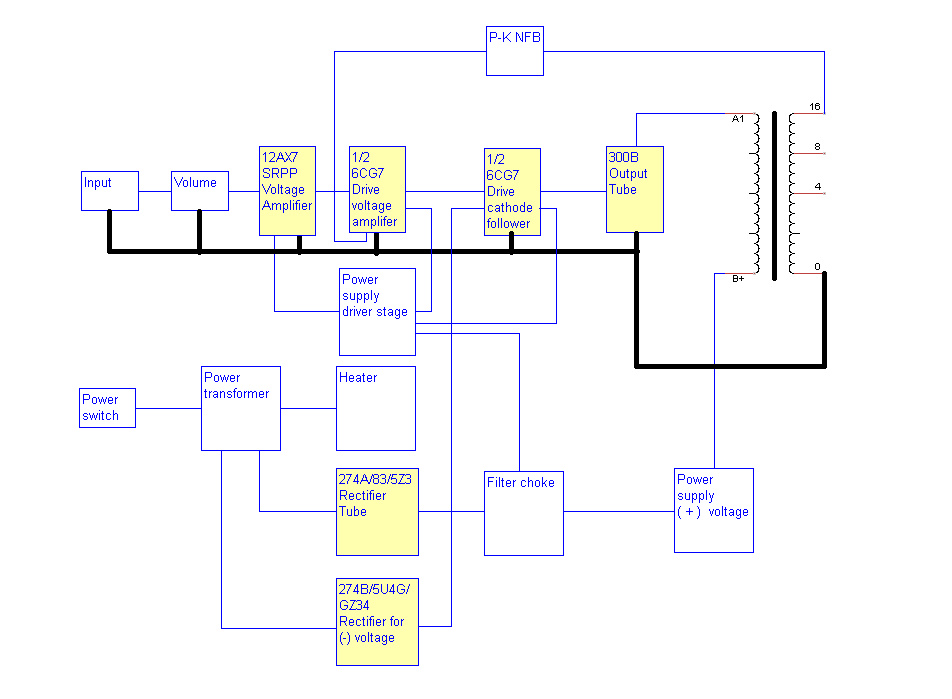 This amplifier was manufactured for Western Electric 300B tube, the current of plate was set only at 60-65mA. Prestage tube is 12AT7, driver tube is 6CG7 (or 6DJ8). Max output 12W for 300B
