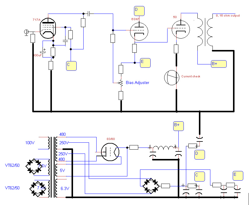 This use 717A as prestage tube and 6SN7 as driver, buffer tube to drive 50' or VT62 tube, rectifier tube is 80 or 83' tube or 5Z3